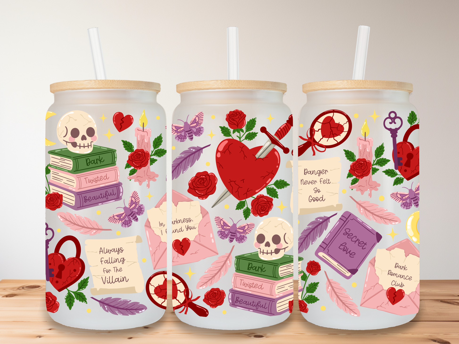 Frosted 16oz glass can made with sublimation design. Each glass can comes with a bamboo lid and re-useable straw.