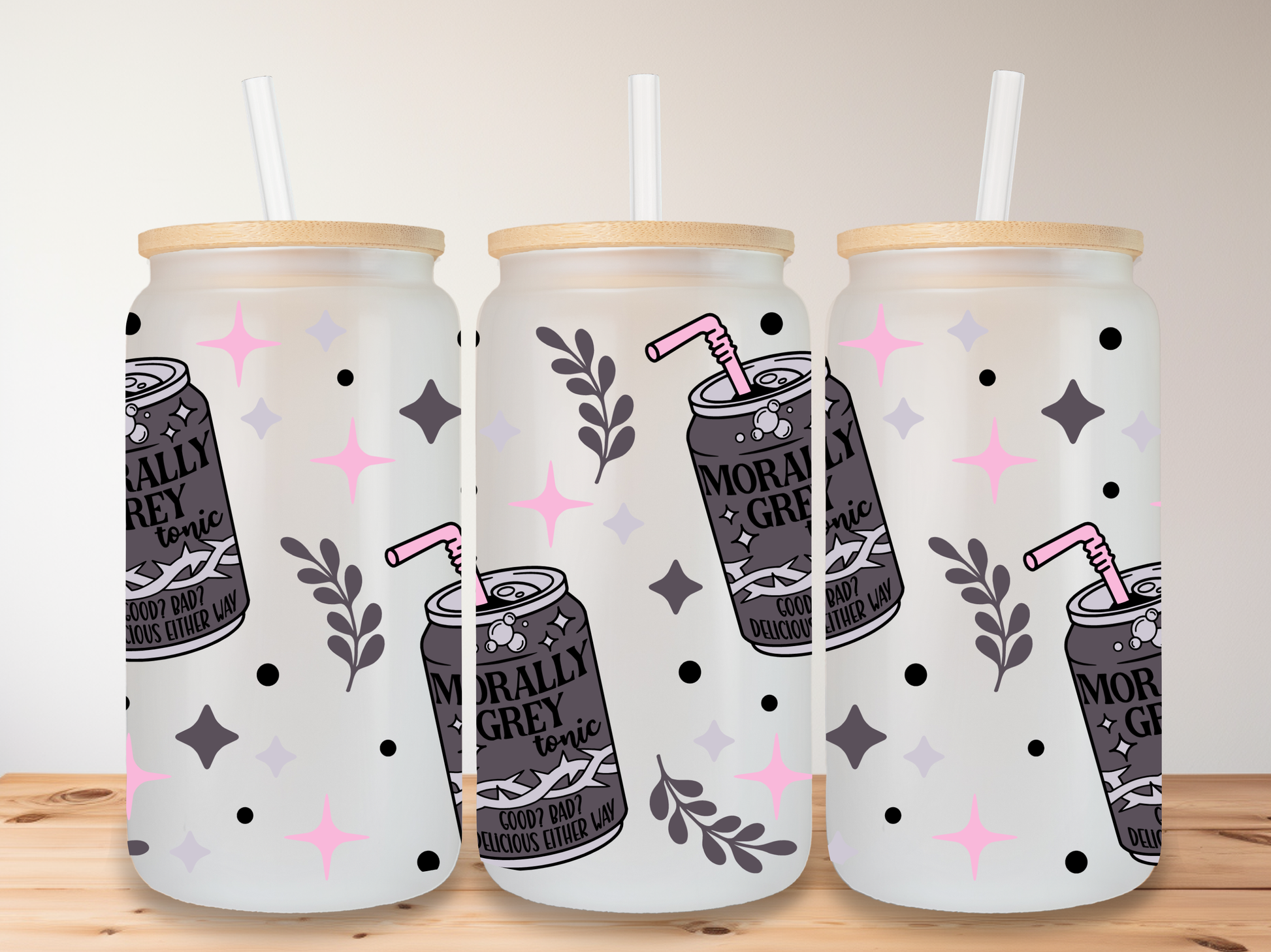 Frosted 16oz glass can made with sublimation design. Each glass can comes with a bamboo lid and re-useable straw.