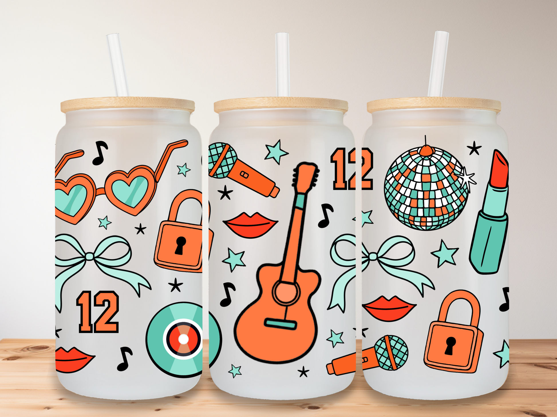 Frosted 16oz glass can made with sublimation design. Each glass can comes with a bamboo lid and re-useable straw.